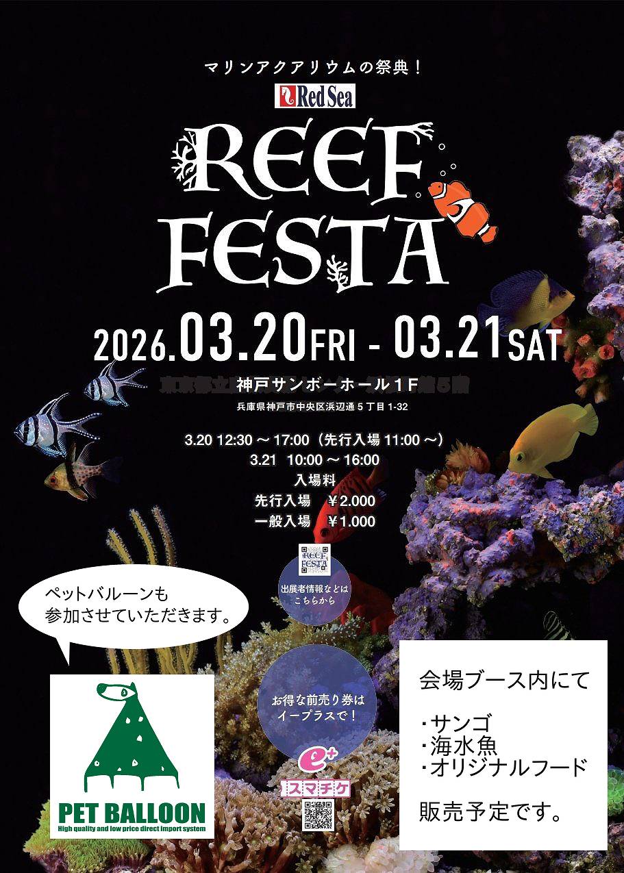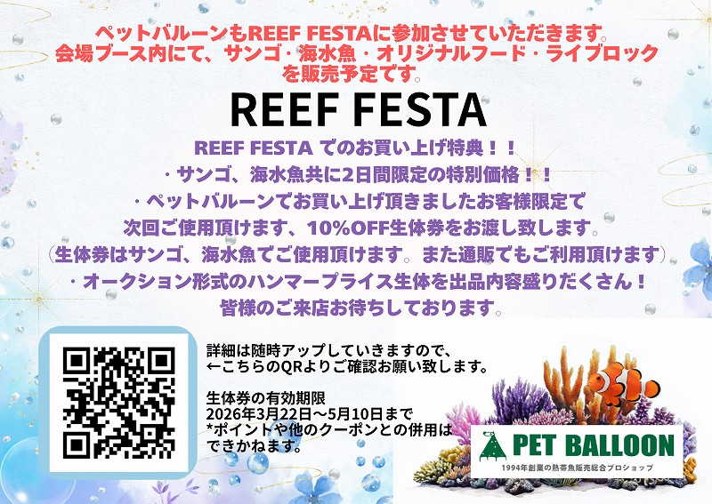 REEF FESTAにペットバルーンが参加させて頂きます!会場ブースにて、サンゴ・海水魚・オリジナルフードを販売予定です。 2026年03月22日 情報が更新され次第こちらに掲載していきます。 次» What's New