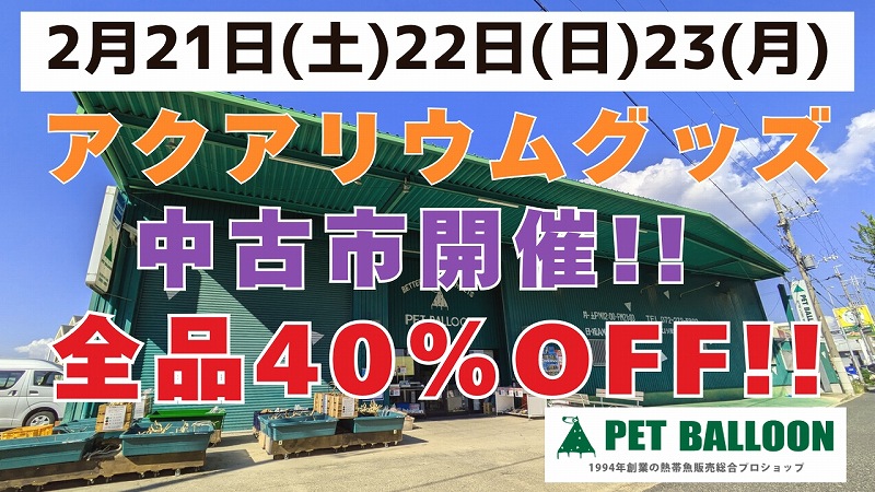 2月21日(土)2月22日(日)2月23日(月)の3日間、中古アクアリウムグッズ全品40%OFF!! 2026年02月18日 ■グリーン会員様限定セールイベント 2月21日(土)、22日(日)、23日(月)の3日間 アクアリウムグッズが全品40%OFFで買える中古市を開催致します!! グリーン会員様限定のセールイベントとなっておりますので、 当日のご入会でも40%OFFでご購入頂けますのでご入会をおまちしております!! «前 次» What's New