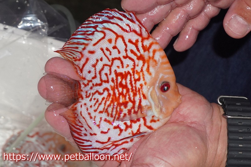 改良品種ディスカス大国のマレーシア・ペナン島屈指のブリーダーTAN CHEE LOK氏の作出したディスカスとなります。氏のファームはその規模、質、生産力どれも世界屈指のレベルとだけあり素晴らしいディスカスを多数保有しております。非常に派手なレッドラインがボディーを覆う非常に美しいピジョン系改良品種となります