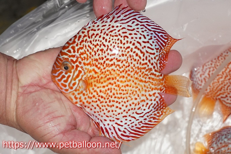 改良品種のレッドスポットグリーンにワイルドロイヤルグリーンを交配した品種となります。ワイルドディスカスらしいイエローベースと鮮やかなレッドスポットが魅力的な個体となります。