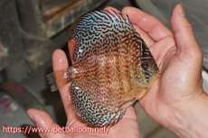 通常の改良品種にはないワイルドディスカスのような非常に濃く鮮やかなイエローベースのカラーに独特の存在感あるレッドスポットとブルーの発色。スポット系ディスカスらしからぬ真ん丸なラウンドボディと相まって素晴らしい迫力感を持ちます。