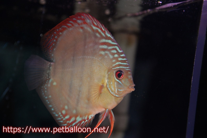 KLディスカスファームのニューストレイン個体です。ワイルドレッドディスカスの有名産地アマゾン河ラーゴパラコニブラッドレッドのより進化したF3個体に明瞭なセンターバーが入るレッドディスカスのイサレッドを交配した個体です。その秀逸な個体の持つ赤さ、センターバー遺伝子を持つこの個体としてどう変化し、次世代へどう引き継がれるかが非常に楽しみな個体と言えます。
