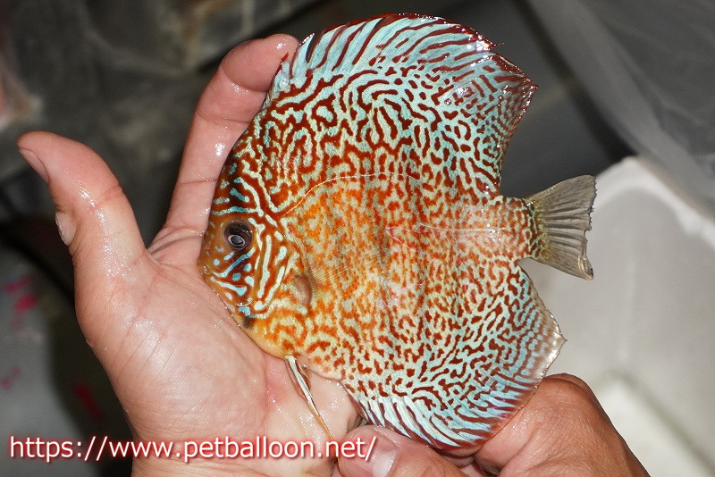 通常の改良品種にはないワイルドディスカスのような非常に濃く鮮やかなイエローベースのカラーに独特の存在感あるレッドスポットとブルーの発色。スポット系ディスカスらしからぬ真ん丸なラウンドボディと相まって素晴らしい迫力感を持ちます。