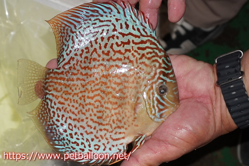 迫力あるフォルムに大き目の複雑なパターンが入るスポット系ディスカス。鮮やかなレッドスポット、ブルーのベースカラーが非常に派手な個体。現地ブリーダー押しペアです