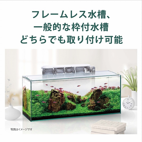 スリムフィルター DC-X L4 新開発DC-Xポンプ採用。極静音新開発DC-Xポンプ採用。ろ過性能UP、極めて静音&省エネ化。奥行スリムタイプだから水槽まわりすっきり。●仕様ろ過槽容量:1.1L適合水槽:水容量60L以下の水槽用流量:6L/分JANコード