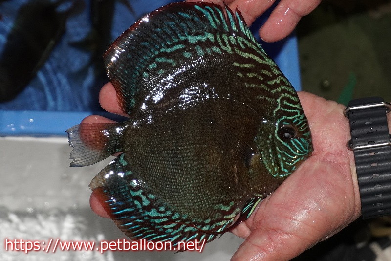 誰もが知る唯一無二のカリスマ、広島B-HOUSE倉津氏が20年以上の歳月をかけて作出した究極かつ唯一無二の完全オリジナルメイドインジャパンディスカス。単純にワイルドレッドディスカスのみを交配したのではなく全てのワイルドディスカスからの交配で作出されており、その赤の深さ、ブルーのラインや発色は意図して創られた究極のディスカスです。氏が話されていたブリーダーではなくデザイナー、アーティストという感覚で鱗の輝きや色質を考え作られたことはこのディスカスを見れば十分に納得いただけると思います。それほどに奥深く、長年交配されてきた完成されたこのディスカスからは他にはないオーラを感じます。早々世の中に出回ることが無い大変貴重な個体です。