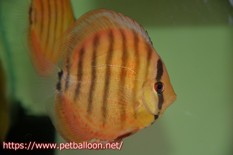 知る人ぞ知る籠谷氏作出のワイルドクロス個体です。過去、ワイルドグリーン、ワイルドブルーなどワイルドディスカスの各種のブリーディングに精通し、カメタブルーダイヤまでブリードしていた氏のブリードした個体で、今回はワイルド アッパーテフェロイヤルグリーン♂×ラーゴパラコニブラッドレッドF2のF1個体です。あのWWFFで作出されたWR25タンジェリンドリームを彷彿させる組み合わせのディスカスとなっており、スポット系グリーンディスカスとソリッドレッドディスカスの組み合わせは多種多様な表現を持つ個体へと成長することでしょう。