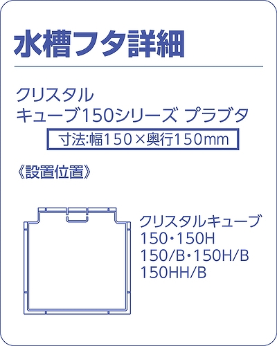 JANコード: 4972814 014657セット内容: 水槽/フタ/ウレタンマット標準価格: オープン価格寸法(mm): W150×D150×H150(2.5L)商品説明: 超小型のキューブ水槽 ・ベタや超小型魚の飼育に最適! ・フタ付 4mmガラス使用