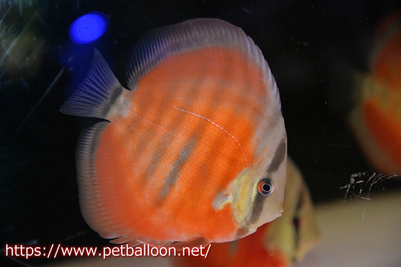 ワイルドレッドディスカスの有名産地アマゾン河ラーゴパラコニブラッドレッドのより進化したF3個体に明瞭なセンターバーが入るレッドディスカスのイサレッドを交配した個体です。その秀逸な個体の持つ赤さ、見事なまでに出現させたセンターバー個体としてどう今後変化し、次世代へどう引き継がれるかが非常に楽しみな個体と言えます。