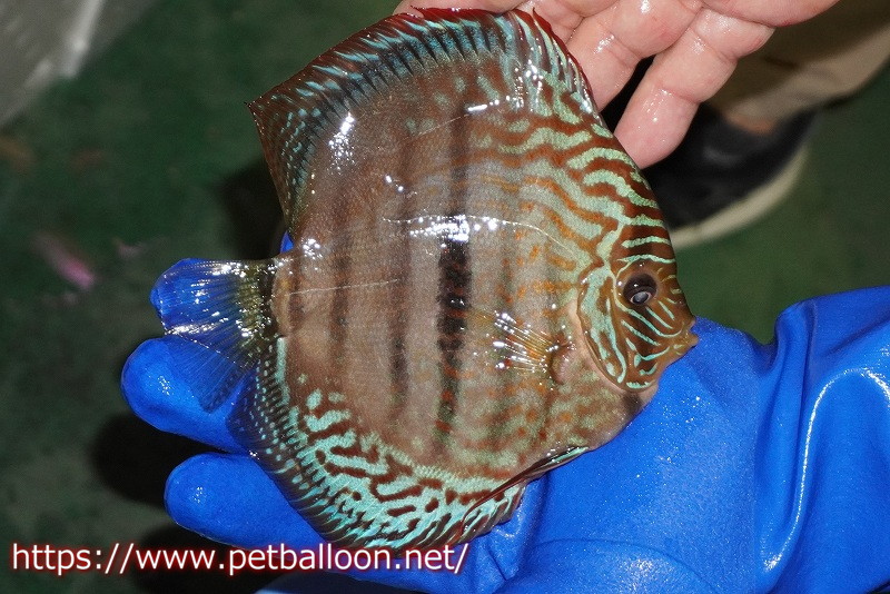 これぞ究極のワイルドクロスディスカス。ワイルドディスカスの有名産地であるラーゴパラコニブラッドレッドをワイルドヘッケルと交配することでパラコニらしいフォルム、ベースカラーに加えはっきりと明瞭に入るセンターバーを持つ今年度最新品種です。ややラインの表現やヘッケルの持つブルーの発色もあり成長ごとの変化が楽しみな個体と言えます。