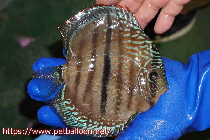 これぞ究極のワイルドクロスディスカス。ワイルドディスカスの有名産地であるラーゴパラコニブラッドレッドをワイルドヘッケルと交配することでパラコニらしいフォルム、ベースカラーに加えはっきりと明瞭に入るセンターバーを持つ今年度最新品種です。ややラインの表現やヘッケルの持つブルーの発色もあり成長ごとの変化が楽しみな個体と言えます。