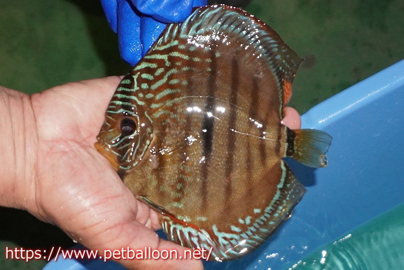 これぞ究極のワイルドクロスディスカス。ワイルドディスカスの有名産地であるラーゴパラコニブラッドレッドをワイルドヘッケルと交配することでパラコニらしいフォルム、ベースカラーに加えはっきりと明瞭に入るセンターバーを持つ今年度最新品種です。ややラインの表現やヘッケルの持つブルーの発色もあり成長ごとの変化が楽しみな個体と言えます。