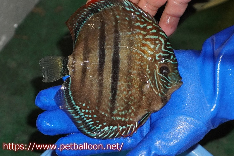 これぞ究極のワイルドクロスディスカス。ワイルドディスカスの有名産地であるラーゴパラコニブラッドレッドをワイルドヘッケルと交配することでパラコニらしいフォルム、ベースカラーに加えはっきりと明瞭に入るセンターバーを持つ今年度最新品種です。ややラインの表現やヘッケルの持つブルーの発色もあり成長ごとの変化が楽しみな個体と言えます。