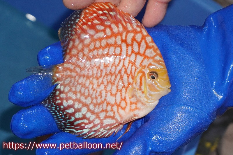 赤と白のパターンがバランスよく入り、非常に派手な発色を見せるピジョン系ディスカス。成長とともに変化するパターンも楽しみの一つと言えます。