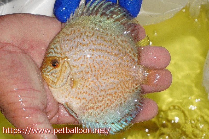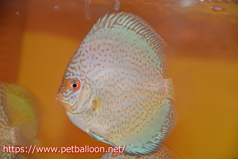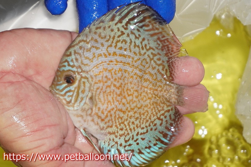 一見ブルー系ディスカスの品種とも思えるこの個体はスポット系ディスカスの血統も持ち合わせており、うっすらと入るスポットの面影はよりブルーの発色を進化させたスポット系統。鮮やかなブルーンのベースカラーにスポットが入るこれまで見たことが無い新しい品種です。