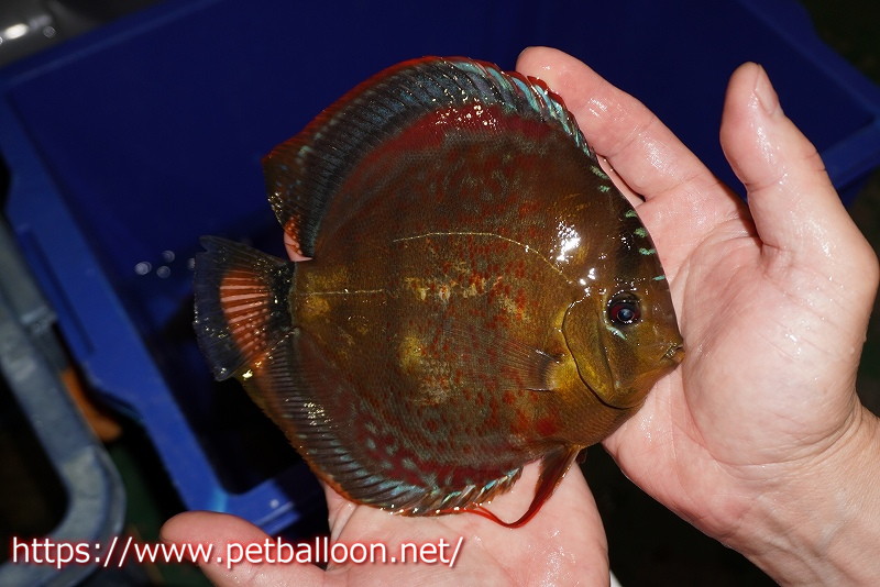 知る人ぞ知る籠谷氏作出のワイルドクロス個体です。過去、ワイルドグリーン、ワイルドブルーなどワイルドディスカスの各種のブリーディングに精通し、カメタブルーダイヤまでブリードしていた氏のブリードした個体で、今回はワイルド アッパーテフェロイヤルグリーン♂×ラーゴパラコニブラッドレッドF2のF1個体です。あのWWFFで作出されたWR25タンジェリンドリームを彷彿させる組み合わせのディスカスとなっており、スポット系グリーンディスカスとソリッドレッドディスカスの組み合わせは多種多様な表現を持つ個体へと成長することでしょう。生後1年未満ながら素晴らしい成長をしております。