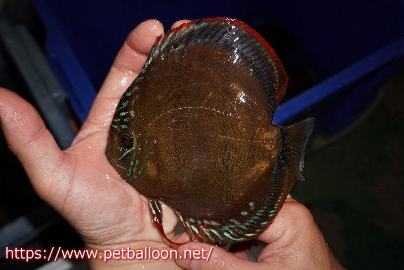 知る人ぞ知る籠谷氏作出のワイルドクロス個体です。過去、ワイルドグリーン、ワイルドブルーなどワイルドディスカスの各種のブリーディングに精通し、カメタブルーダイヤまでブリードしていた氏のブリードした個体で、今回はワイルド アッパーテフェロイヤルグリーン♂×ラーゴパラコニブラッドレッドF2のF1個体です。あのWWFFで作出されたWR25タンジェリンドリームを彷彿させる組み合わせのディスカスとなっており、スポット系グリーンディスカスとソリッドレッドディスカスの組み合わせは多種多様な表現を持つ個体へと成長することでしょう。生後1年未満ながら素晴らしい成長をしております。