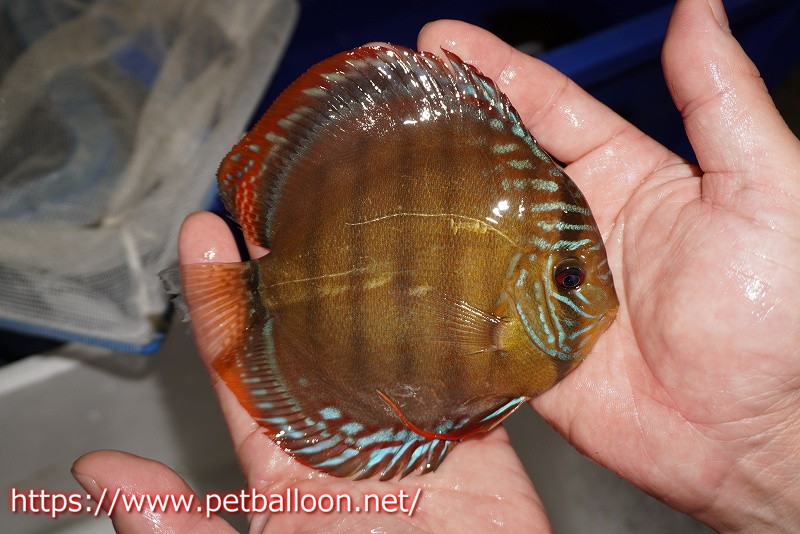 知る人ぞ知る籠谷氏作出のワイルドクロス個体です。過去、ワイルドグリーン、ワイルドブルーなどワイルドディスカスの各種のブリーディングに精通し、カメタブルーダイヤまでブリードしていた氏のブリードした個体で、今回はワイルド アッパーテフェロイヤルグリーン♂×ラーゴパラコニブラッドレッドF2のF1個体です。あのWWFFで作出されたWR25タンジェリンドリームを彷彿させる組み合わせのディスカスとなっており、スポット系グリーンディスカスとソリッドレッドディスカスの組み合わせは多種多様な表現を持つ個体へと成長することでしょう。生後1年未満ながら素晴らしい成長をしております。