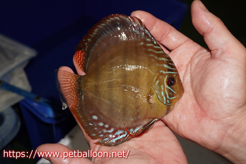知る人ぞ知る籠谷氏作出のワイルドクロス個体です。過去、ワイルドグリーン、ワイルドブルーなどワイルドディスカスの各種のブリーディングに精通し、カメタブルーダイヤまでブリードしていた氏のブリードした個体で、今回はワイルド アッパーテフェロイヤルグリーン♂×ラーゴパラコニブラッドレッドF2のF1個体です。あのWWFFで作出されたWR25タンジェリンドリームを彷彿させる組み合わせのディスカスとなっており、スポット系グリーンディスカスとソリッドレッドディスカスの組み合わせは多種多様な表現を持つ個体へと成長することでしょう。生後1年未満ながら素晴らしい成長をしております。