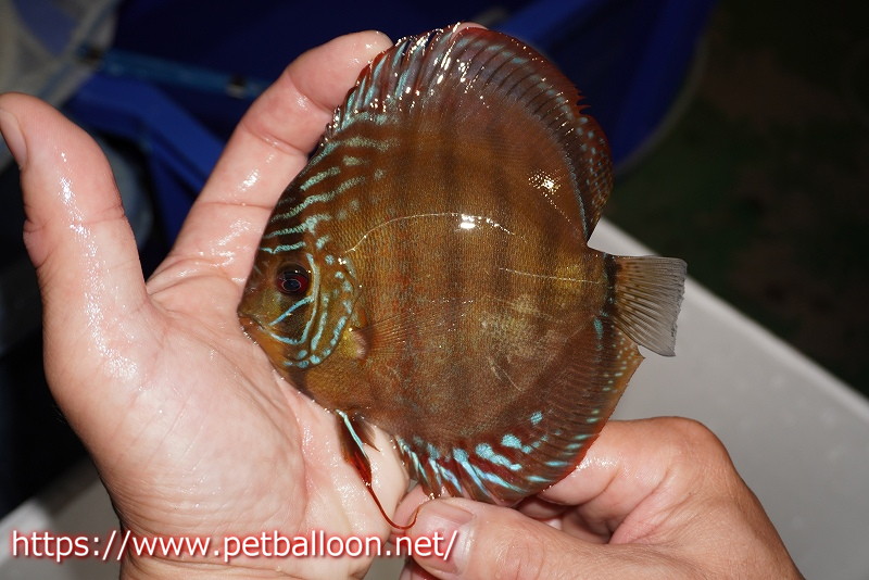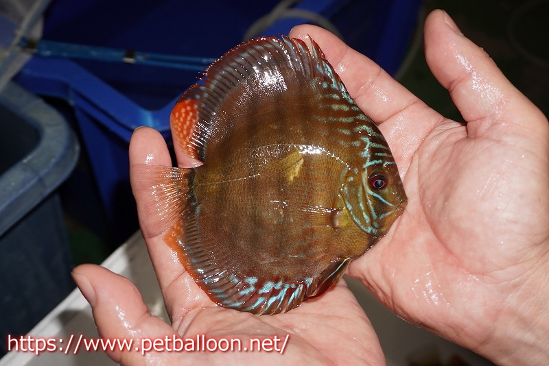 知る人ぞ知る籠谷氏作出のワイルドクロス個体です。過去、ワイルドグリーン、ワイルドブルーなどワイルドディスカスの各種のブリーディングに精通し、カメタブルーダイヤまでブリードしていた氏のブリードした個体で、今回はワイルド アッパーテフェロイヤルグリーン♂×ラーゴパラコニブラッドレッドF2のF1個体です。あのWWFFで作出されたWR25タンジェリンドリームを彷彿させる組み合わせのディスカスとなっており、スポット系グリーンディスカスとソリッドレッドディスカスの組み合わせは多種多様な表現を持つ個体へと成長することでしょう。生後1年未満ながら素晴らしい成長をしております。