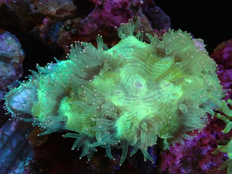 【送料無料対象商品】【サンゴ】【通販】トランペットコーラル(Metallic Green/イエローチップ)Mサイズ(個体販売)(±11cm)No.7(生体)(サンゴ)