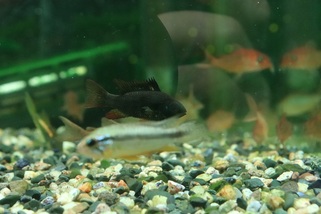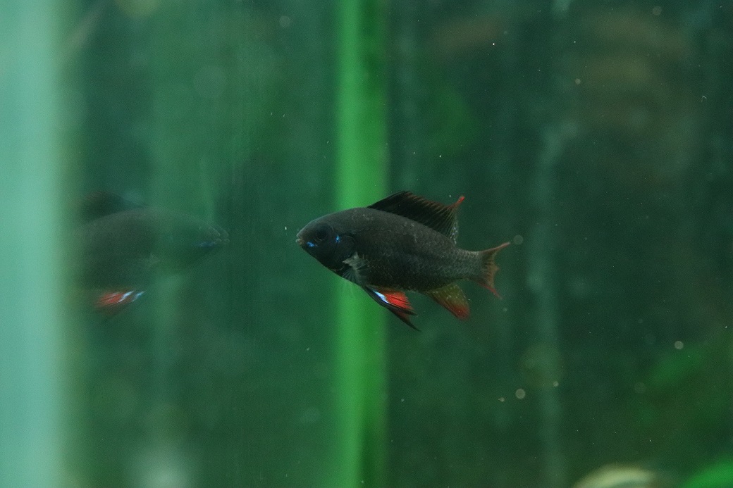 スーパーブラックラミレジィよりも更に黒みの増した、ダークナイトが入荷致しました。入荷頻度は少なく、ただの黒ではなく、黒のボディで各ヒレは綺麗に色が染まっております。入荷頻度は少ない種類となりますので、是非!!混泳しておりますので、ヒレ裂け等はご了承ください。