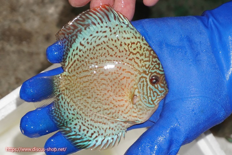 一見ブルー系ディスカスの品種とも思えるこの個体はスポット系ディスカスの血統も持ち合わせており、うっすらと入るスポットの面影はよりブルーの発色を進化させたスポット系統。鮮やかなブルーンのベースカラーにスポットが入るこれまで見たことが無い新しい品種です。