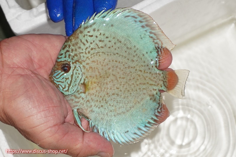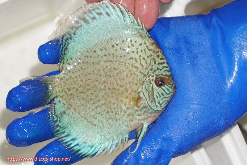 一見ブルー系ディスカスの品種とも思えるこの個体はスポット系ディスカスの血統も持ち合わせており、うっすらと入るスポットの面影はよりブルーの発色を進化させたスポット系統。鮮やかなブルーンのベースカラーにスポットが入るこれまで見たことが無い新しい品種です。