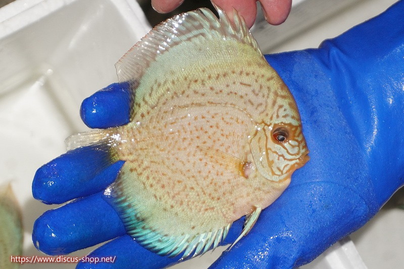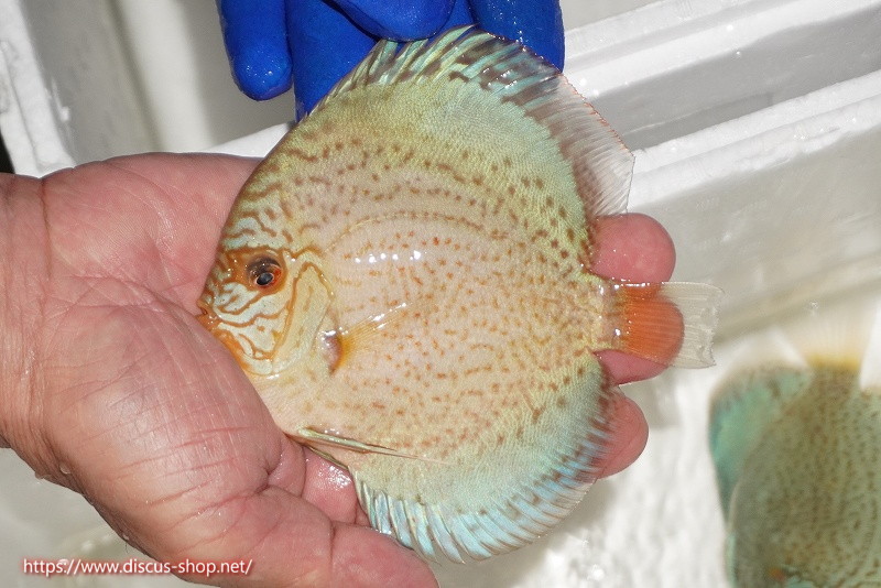 一見ブルー系ディスカスの品種とも思えるこの個体はスポット系ディスカスの血統も持ち合わせており、うっすらと入るスポットの面影はよりブルーの発色を進化させたスポット系統。鮮やかなブルーンのベースカラーにスポットが入るこれまで見たことが無い新しい品種です。