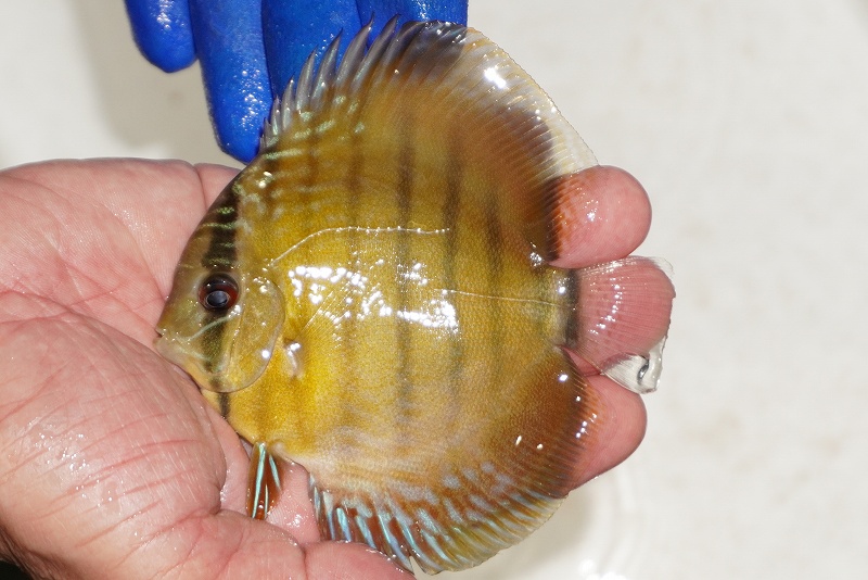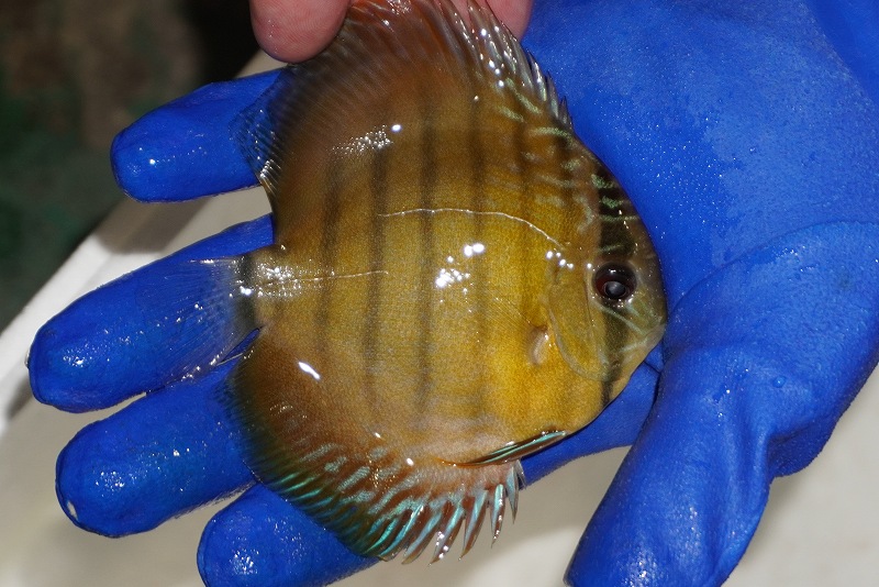 イエローベースが美しいソリッド、ソリッドセンターバー、ロイヤルブルーが混生するウラリアチャンネルに絡む有名産地。 きめ細かな鱗からの上品な発色、ロイヤル個体の明瞭なラインパターン、千差万別の個体差はワイルドディスカスの魅力を存分に持ち合わせた個体といえます。この個体は混生エリアには珍しい純粋なブルーディスカスかと思います。