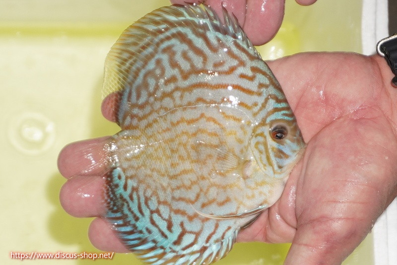 青系ディスカスの王道ブリリアントの中でもこれほど発色良くバランスが良い個体は早々おらずフォルム良し、発色良しと文句なしの個体と言えます。今後よりその青みは増しパターンも相まって変化してゆくので非常に楽しみある個体です。