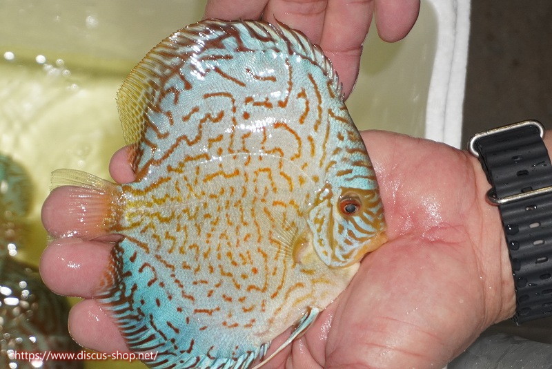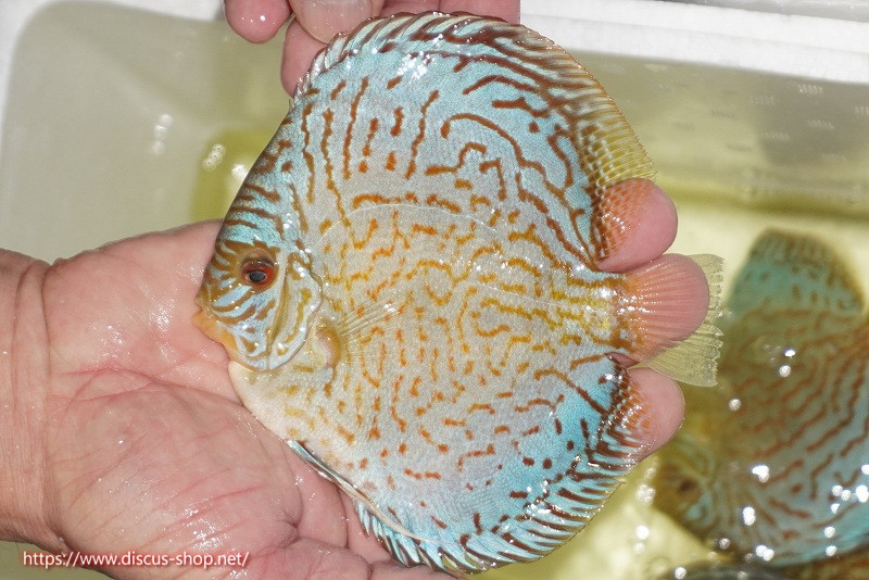 青系ディスカスの王道ブリリアントの中でもこれほど発色良くバランスが良い個体は早々おらずフォルム良し、発色良しと文句なしの個体と言えます。今後よりその青みは増しパターンも相まって変化してゆくので非常に楽しみある個体です。