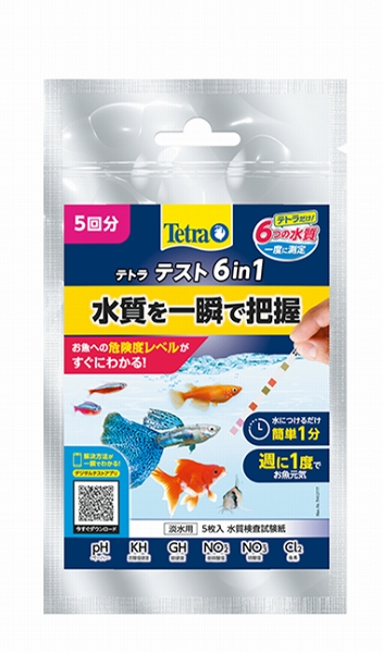 水質を一瞬で把握複数の水質を一瞬でチェック!大事な水槽の水質を一瞬で測定し、状態を把握できる試験紙です。水換えのタイミングや、お魚ごとに違う最適な水質が分かります。6つの水質項目を1度に測れるのはテトラだけ!水につけるだけ簡単1分!
