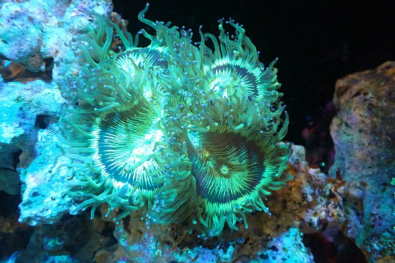 【サンゴ】【通販】トランペットコーラル(メタリックグリーン/ブルーチップ)Mサイズ(個体販売)(±10-12cm)No.1(生体)(サンゴ)