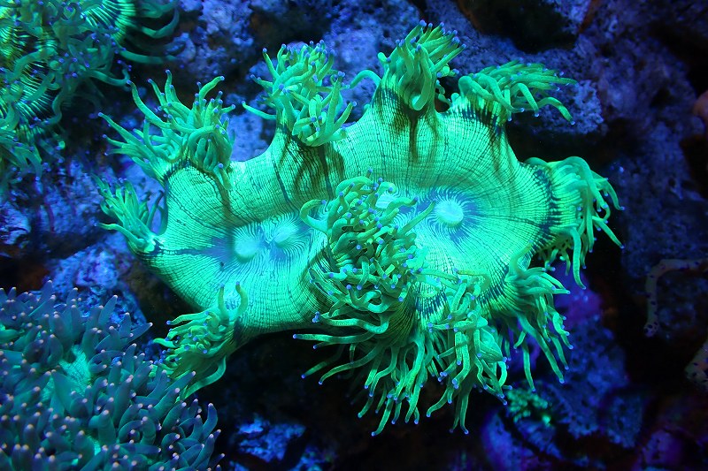【サンゴ】【通販】トランペットコーラル(メタリックグリーン/ブルーチップ)Mサイズ(個体販売)(±10-12cm)No.4(生体)(サンゴ)