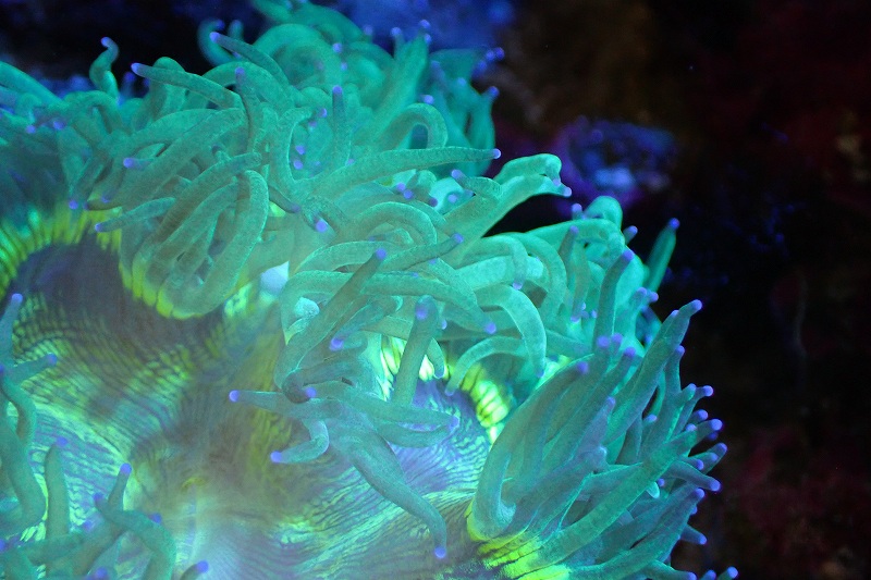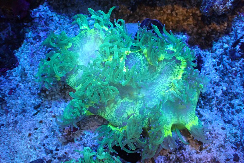 【サンゴ】【通販】トランペットコーラル(メタリックグリーン/ブルーチップ)Mサイズ(個体販売)(±10-12cm)No.5(生体)(サンゴ)