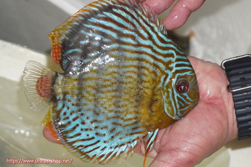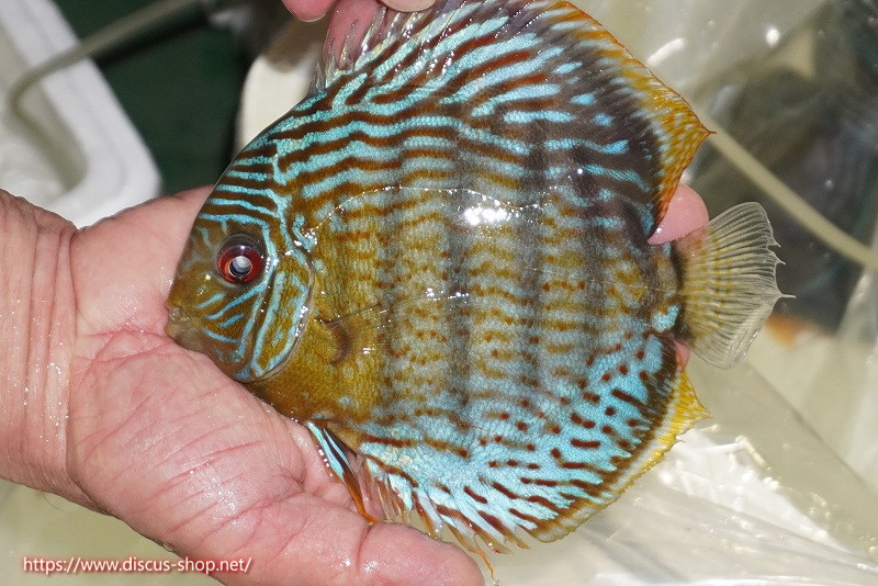 グリーンディスカスの中でも最もバリエーションが豊富でラージスポットタイプ、スポットラインタイプをはじめ、ロイヤルラインタイプなどの極上個体。またベースカラーの黄色、ホリゾンタルラインの青み、スポットの赤と最もカラフルな種となります。仕上がれば改良品種顔負けのど派手なパターンを持つ魅力的な産地の個体となります。