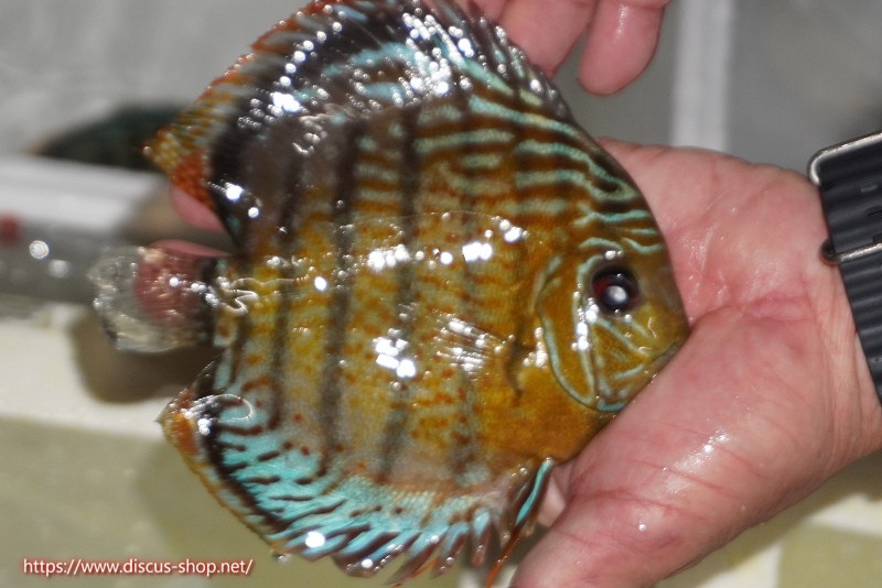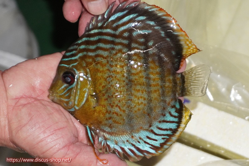 グリーンディスカスの中でも最もバリエーションが豊富でラージスポットタイプ、スポットラインタイプをはじめ、ロイヤルラインタイプなどの極上個体。またベースカラーの黄色、ホリゾンタルラインの青み、スポットの赤と最もカラフルな種となります。仕上がれば改良品種顔負けのど派手なパターンを持つ魅力的な産地の個体となります。