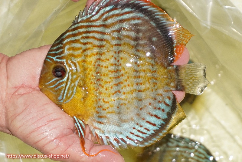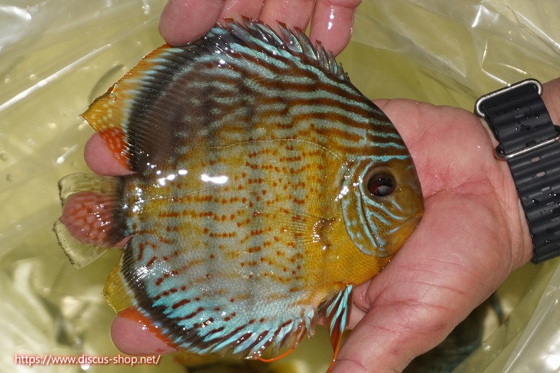 グリーンディスカスの中でも最もバリエーションが豊富でラージスポットタイプ、スポットラインタイプをはじめ、ロイヤルラインタイプなどの極上個体。またベースカラーの黄色、ホリゾンタルラインの青み、スポットの赤と最もカラフルな種となります。仕上がれば改良品種顔負けのど派手なパターンを持つ魅力的な産地の個体となります。