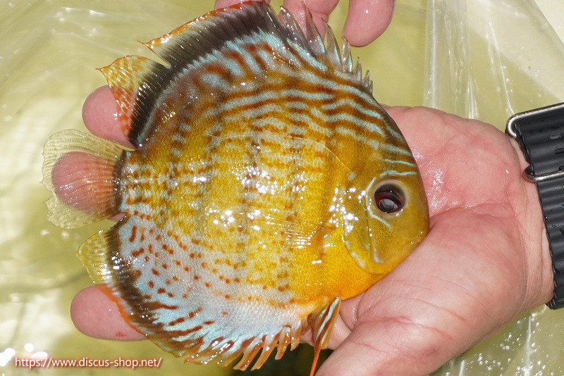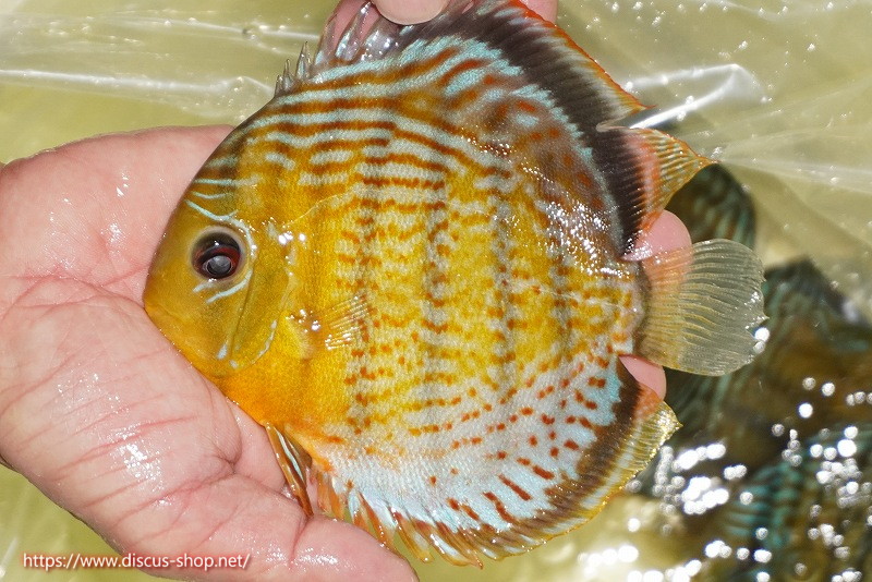 グリーンディスカスの中でも最もバリエーションが豊富でラージスポットタイプ、スポットラインタイプをはじめ、ロイヤルラインタイプなどの極上個体。またベースカラーの黄色、ホリゾンタルラインの青み、スポットの赤と最もカラフルな種となります。仕上がれば改良品種顔負けのど派手なパターンを持つ魅力的な産地の個体となります。