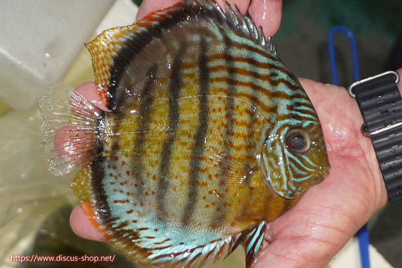 グリーンディスカスの中でも最もバリエーションが豊富でラージスポットタイプ、スポットラインタイプをはじめ、ロイヤルラインタイプなどの極上個体。またベースカラーの黄色、ホリゾンタルラインの青み、スポットの赤と最もカラフルな種となります。仕上がれば改良品種顔負けのど派手なパターンを持つ魅力的な産地の個体となります。