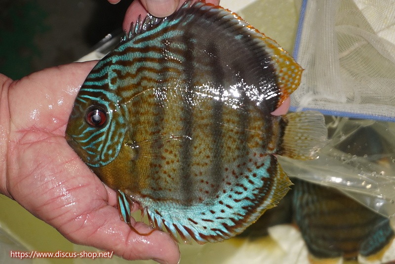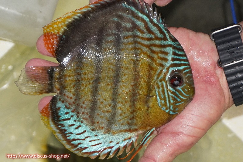 グリーンディスカスの中でも最もバリエーションが豊富でラージスポットタイプ、スポットラインタイプをはじめ、ロイヤルラインタイプなどの極上個体。またベースカラーの黄色、ホリゾンタルラインの青み、スポットの赤と最もカラフルな種となります。仕上がれば改良品種顔負けのど派手なパターンを持つ魅力的な産地の個体となります。
