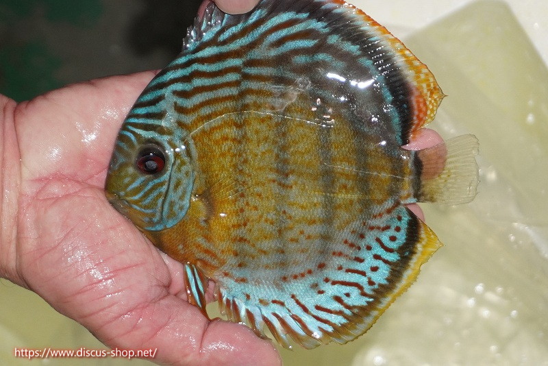 グリーンディスカスの中でも最もバリエーションが豊富でラージスポットタイプ、スポットラインタイプをはじめ、ロイヤルラインタイプなどの極上個体。またベースカラーの黄色、ホリゾンタルラインの青み、スポットの赤と最もカラフルな種となります。仕上がれば改良品種顔負けのど派手なパターンを持つ魅力的な産地の個体となります。