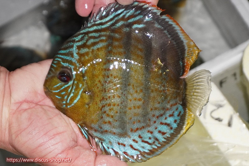 グリーンディスカスの中でも最もバリエーションが豊富でラージスポットタイプ、スポットラインタイプをはじめ、ロイヤルラインタイプなどの極上個体。またベースカラーの黄色、ホリゾンタルラインの青み、スポットの赤と最もカラフルな種となります。仕上がれば改良品種顔負けのど派手なパターンを持つ魅力的な産地の個体となります。