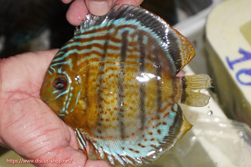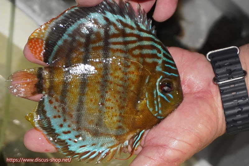 グリーンディスカスの中でも最もバリエーションが豊富でラージスポットタイプ、スポットラインタイプをはじめ、ロイヤルラインタイプなどの極上個体。またベースカラーの黄色、ホリゾンタルラインの青み、スポットの赤と最もカラフルな種となります。仕上がれば改良品種顔負けのど派手なパターンを持つ魅力的な産地の個体となります。