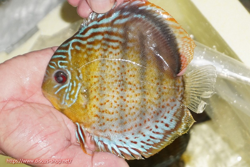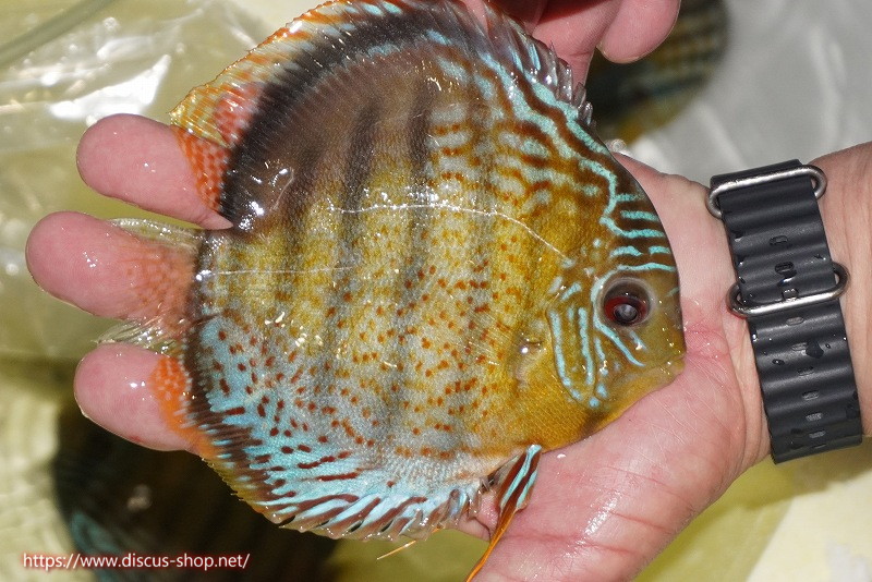 グリーンディスカスの中でも最もバリエーションが豊富でラージスポットタイプ、スポットラインタイプをはじめ、ロイヤルラインタイプなどの極上個体。またベースカラーの黄色、ホリゾンタルラインの青み、スポットの赤と最もカラフルな種となります。仕上がれば改良品種顔負けのど派手なパターンを持つ魅力的な産地の個体となります。