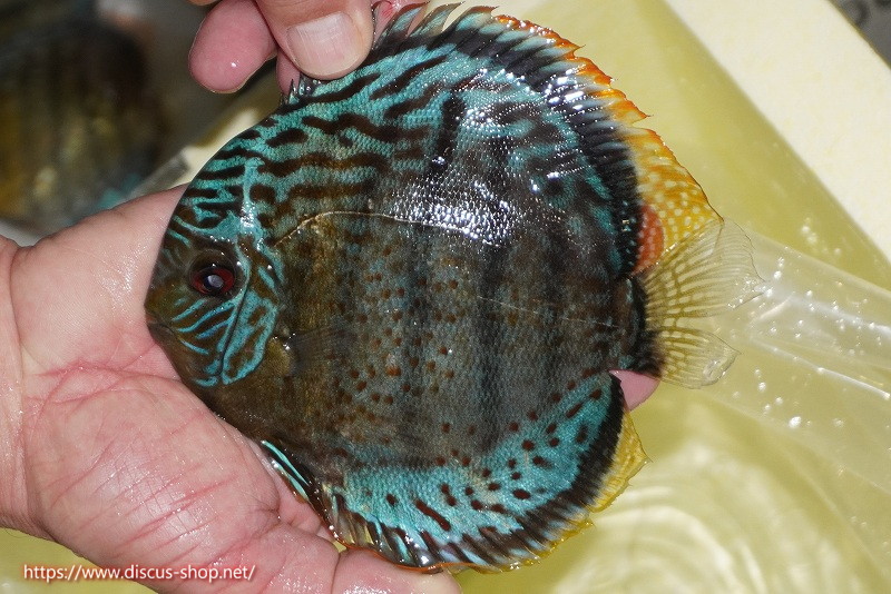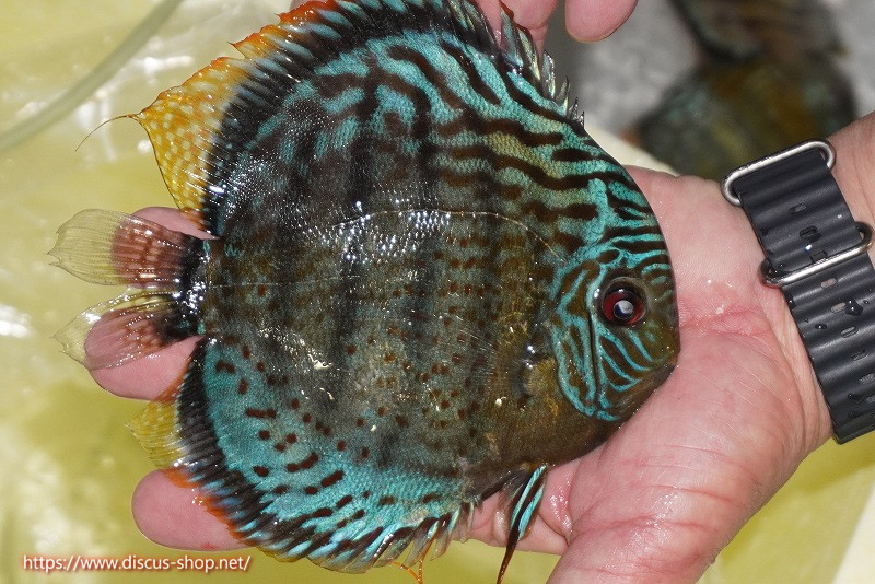 グリーンディスカスの中でも最もバリエーションが豊富でラージスポットタイプ、スポットラインタイプをはじめ、ロイヤルラインタイプなどの極上個体。またベースカラーの黄色、ホリゾンタルラインの青み、スポットの赤と最もカラフルな種となります。仕上がれば改良品種顔負けのど派手なパターンを持つ魅力的な産地の個体となります。