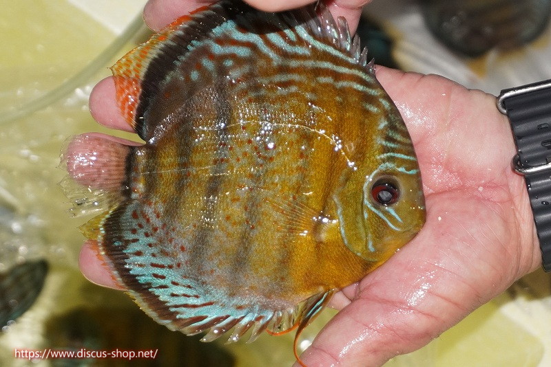 グリーンディスカスの中でも最もバリエーションが豊富でラージスポットタイプ、スポットラインタイプをはじめ、ロイヤルラインタイプなどの極上個体。またベースカラーの黄色、ホリゾンタルラインの青み、スポットの赤と最もカラフルな種となります。仕上がれば改良品種顔負けのど派手なパターンを持つ魅力的な産地の個体となります。