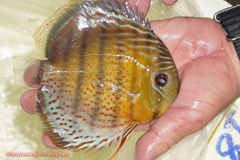 グリーンディスカスの中でも最もバリエーションが豊富でラージスポットタイプ、スポットラインタイプをはじめ、ロイヤルラインタイプなどの極上個体。またベースカラーの黄色、ホリゾンタルラインの青み、スポットの赤と最もカラフルな種となります。仕上がれば改良品種顔負けのど派手なパターンを持つ魅力的な産地の個体となります。