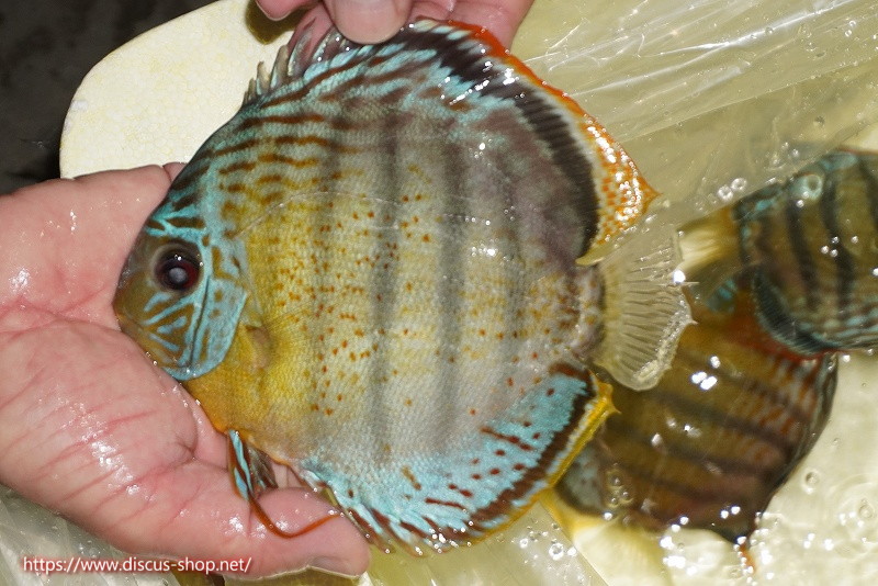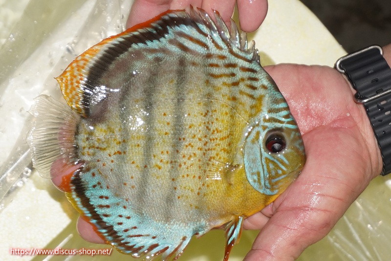 グリーンディスカスの中でも最もバリエーションが豊富でラージスポットタイプ、スポットラインタイプをはじめ、ロイヤルラインタイプなどの極上個体。またベースカラーの黄色、ホリゾンタルラインの青み、スポットの赤と最もカラフルな種となります。仕上がれば改良品種顔負けのど派手なパターンを持つ魅力的な産地の個体となります。
